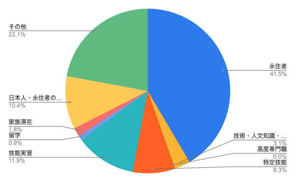 また、在留資格の内訳では、永住者が141,798人、技能実習が40,700人と、ベトナムと同様、技能実習および特定技能制度を利用するケースが多く見られます。