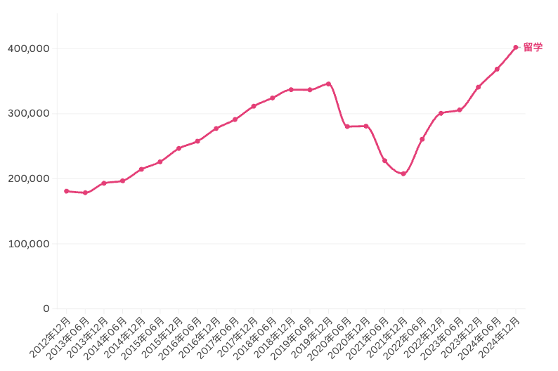 在留外国人統計(旧登録外国人統計) 在留外国人統計によると、2024年12月時点で、在留資格「留学」をお持ちの総人数は約40万人。